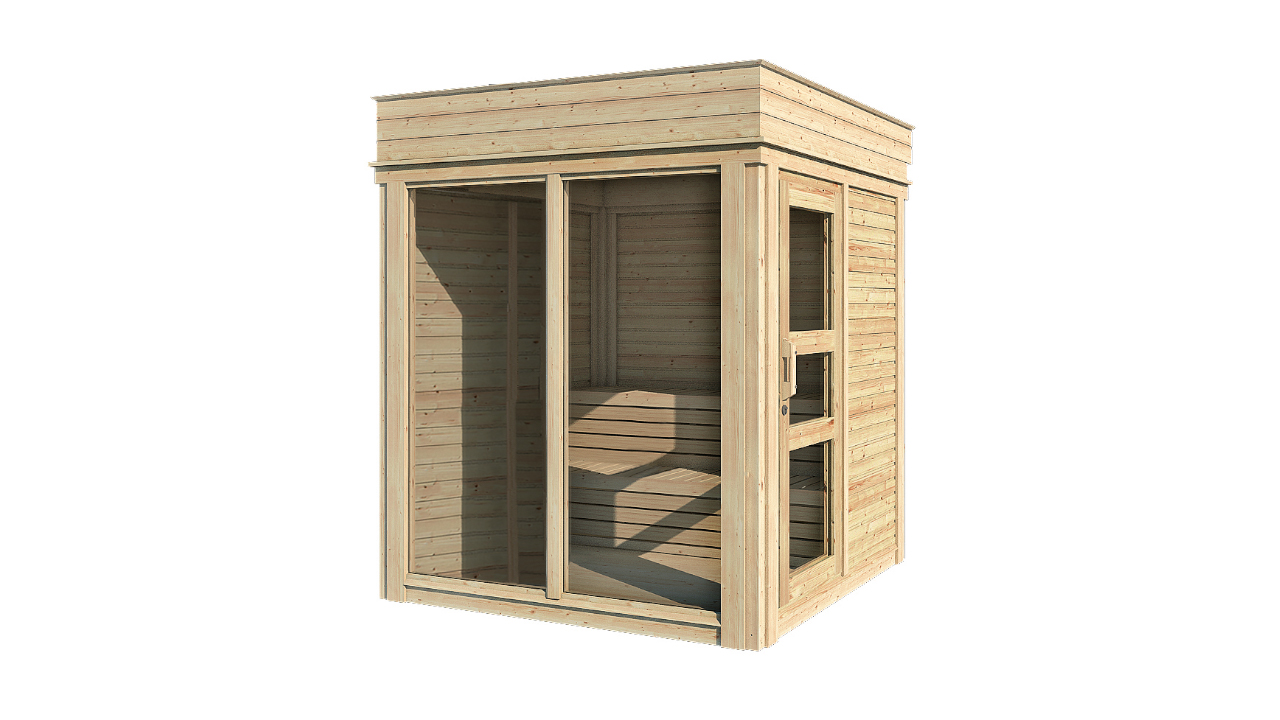 Mit dem planeo Saunahaus-Bausatz können Sie mit Freunden gemeinsam auf einer Grundfläche von ca. 5m² wohltuende Saunagänge genießen. Gemütlich können es sich 2 Personen liegend und bis zu 6 Personen sitzend auf den astfreien Espenholz-Bänken machen. Sie erhalten einen hellen Raum durch eine verglaste Leimholztür und Glaselement-Wänden.