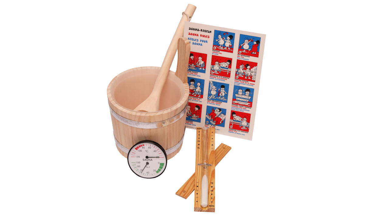 planeo Saunaset Sanduhr, Eimer mit Kunststoffeinsatz, Schöpfkelle, Klimamesser, Saunaregeltafel Artikelnr.: 315625