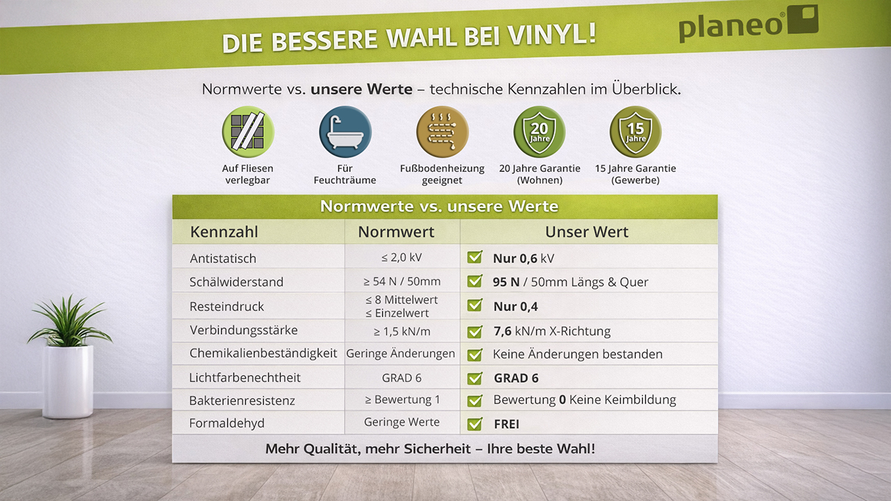 | Besonderheiten | Trittschall integriert, Feuchtraumgeeignet, Rutschfest, XL Format, Einfache Montage, TOP10 Klick-Vinyl, Als Treppenstufe geeignet |