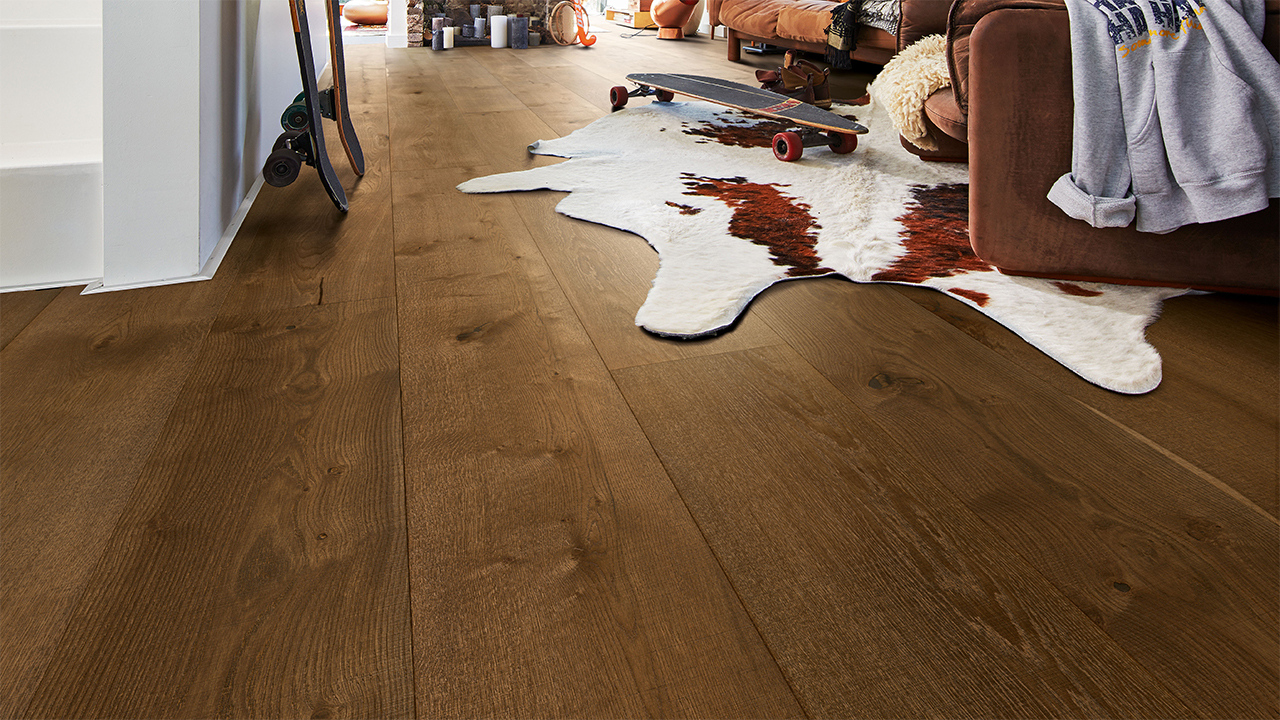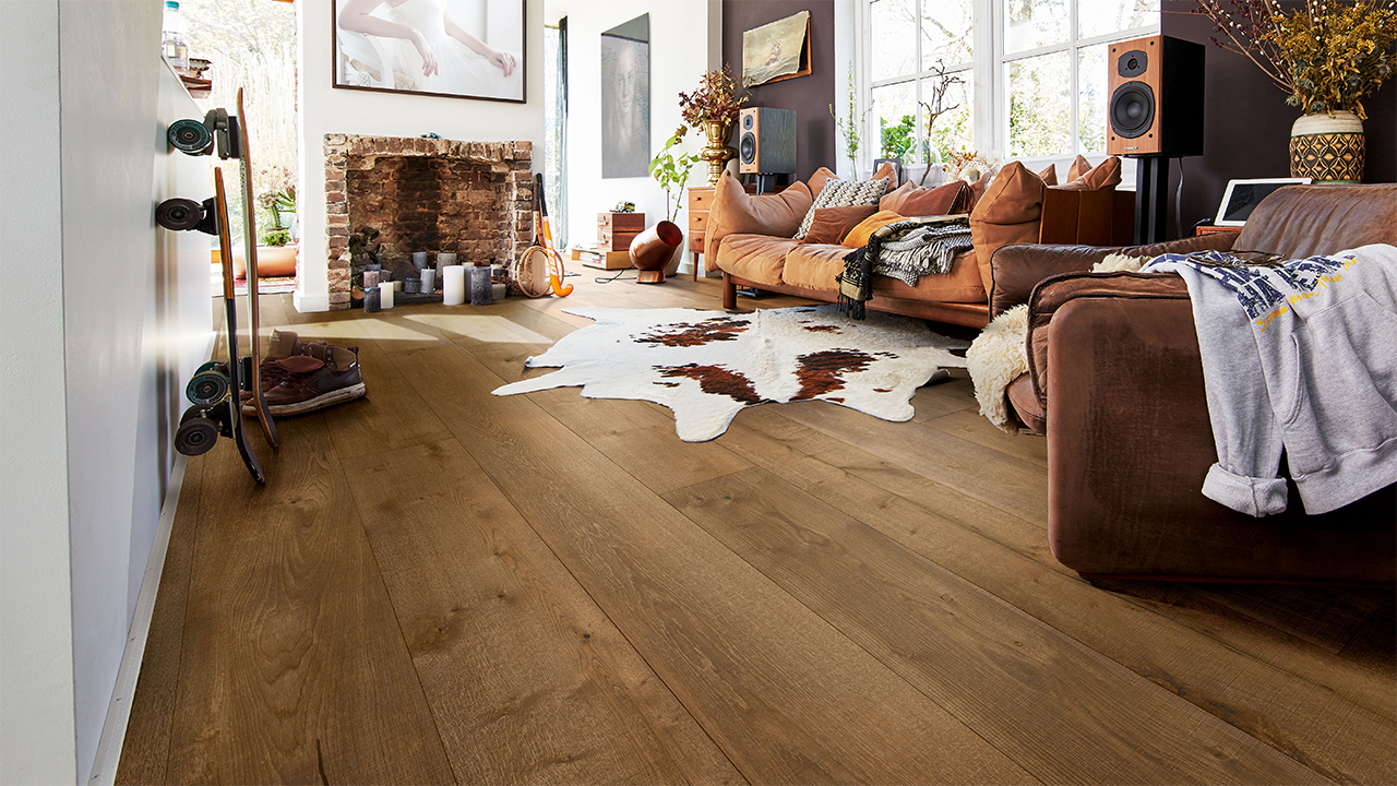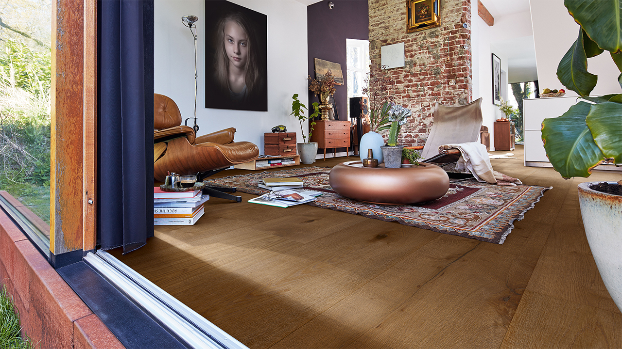 Der Lindura-Holzboden HD 400 verbindet die natürliche Schönheit von Echtholz mit einem besonders widerstandsfähigen Produktaufbau. Die großzügige Schlossdiele bringt Holzflächen vor allem in offenen und repräsentativen Räumen eindrucksvoll zur Geltung.