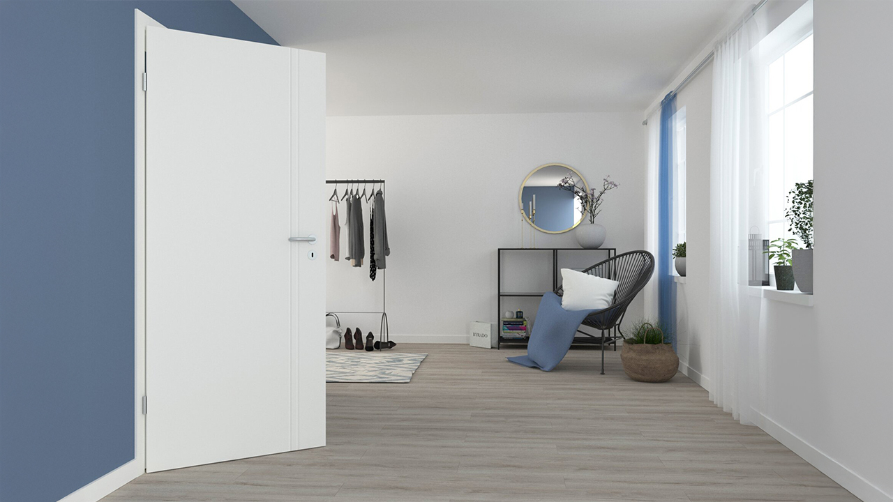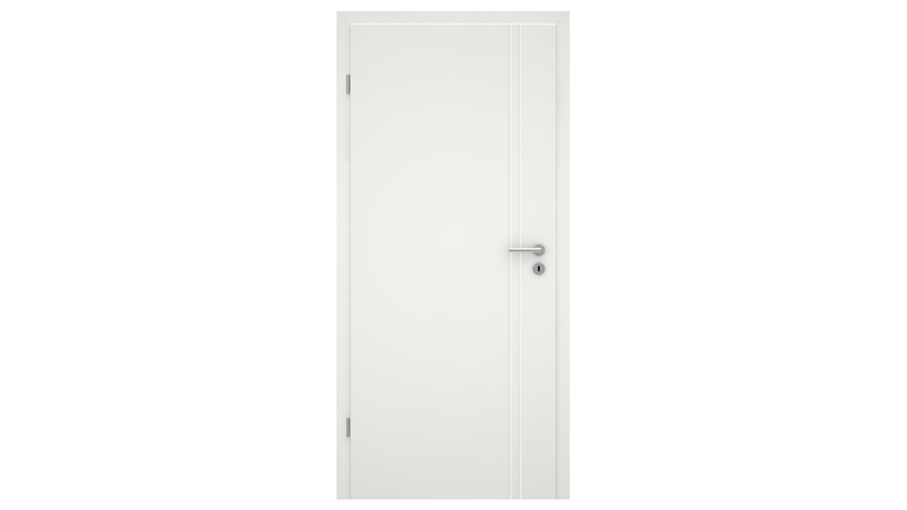 Deux gaufrages étroits et verticaux structurent discrètement le panneau de porte et lui confèrent un effet équilibré et harmonieux. Le chant d'angle réalisé avec précision souligne les lignes claires et souligne le caractère intemporel de la porte.