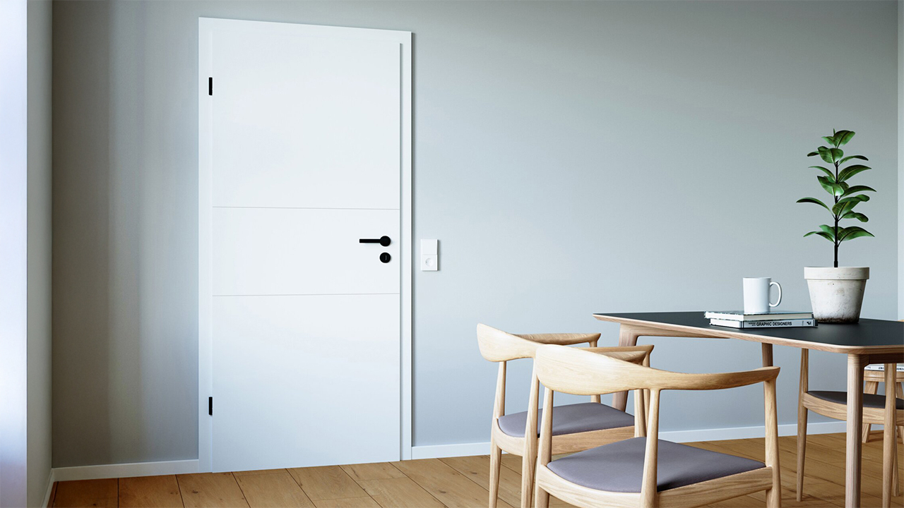 La porte d'intérieur design blanche PUREA Vivo 3 se distingue par ses fraisages rainurés précis de 3 mm, qui confèrent à la porte une élégance claire et moderne tout en lui donnant une vitalité subtile. Deux fines lignes horizontales s'étendent sur le panneau de porte et soulignent le design rectiligne et minimaliste.
