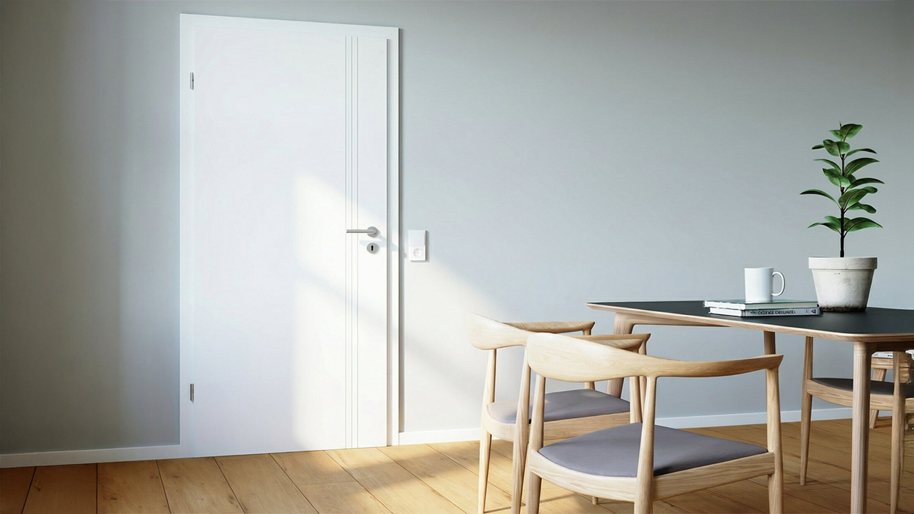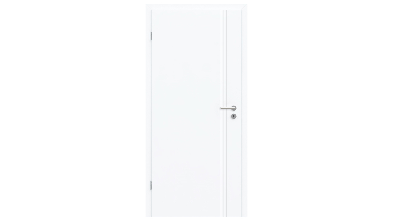 La porte d'intérieur design blanche PUREA Vivo 6 se distingue par ses rainures précises de 3 mm qui confèrent à la porte une élégance claire et moderne tout en lui donnant une vitalité subtile. Trois fines lignes verticales à intervalles rapprochés indiquent de manière décorative le côté de la porte qui doit être ouvert.