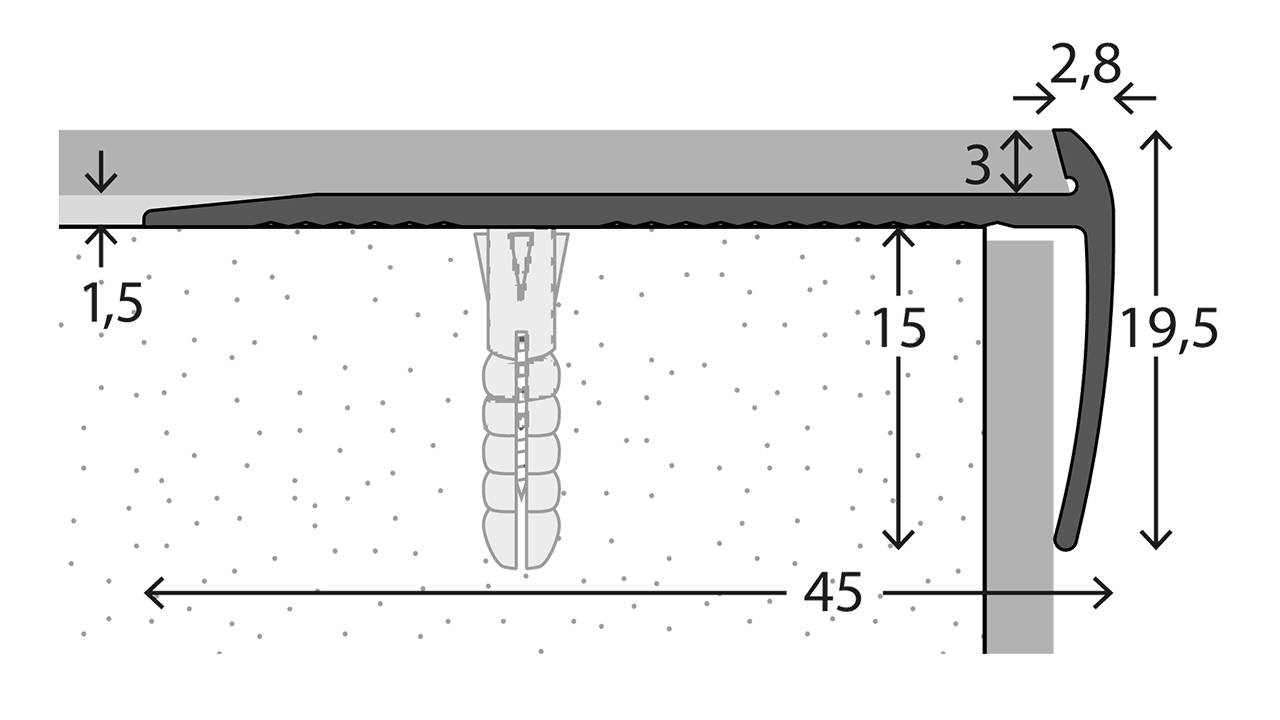 Le profilé est vissé et assure une finition soignée et de qualité grâce à des trous de vis encastrés. Idéal pour les revêtements de sol design, les vinyles à coller ainsi que les revêtements de sol textiles et élastiques - pour une bordure adaptée aux escaliers, qui protège de manière fiable au quotidien et offre une finition optique claire.
