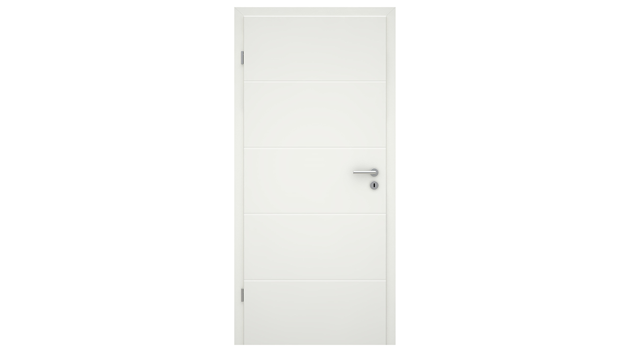 Quattro stretti rilievi disposti orizzontalmente strutturano in modo discreto l'anta della porta e conferiscono profondità al design senza interrompere le linee chiare. Il bordo angolare, eseguito con precisione, sottolinea il carattere lineare della porta e garantisce un look moderno e senza tempo.