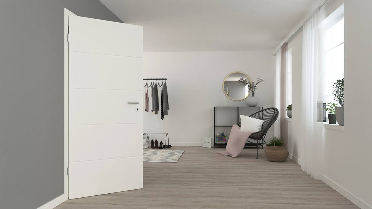 Per un look complessivo armonioso, sono disponibili cornici abbinate in bianco 9010, che completano in modo coerente l'aspetto minimalista della porta. Se si desidera creare accenti specifici, è possibile abbinare la porta a ferramenta nere per creare un contrasto emozionante con il colore bianco chiaro.